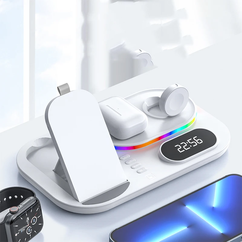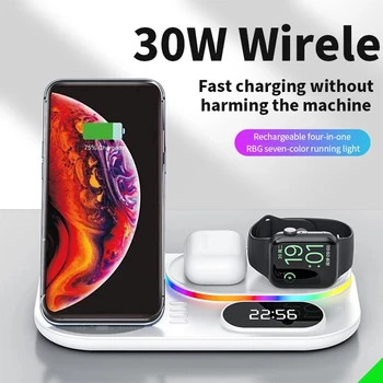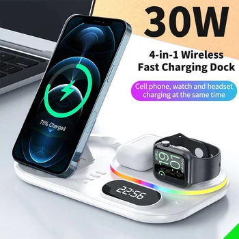 30W 4 In1 Wireless Fast Charger Stand LED RGB Charging Dock Station with Digital Clock for iPhone 13 12 Earphone Watch 6 5