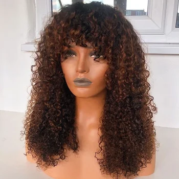 Cuticle Aligned 1B/30 Brown Kinky Curly Peruvian Human Hair Lace Frontal Wigs With Bang